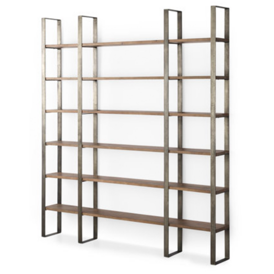 This towering shelving unit features six tiers of mango wood shelves with open sides and back! It is supported and divided by four iron-frame posts that give it a sense of simple elegance.