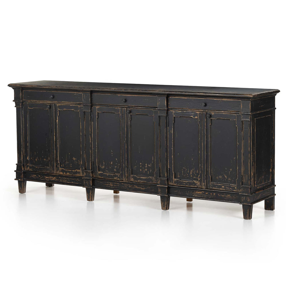 Inspired by European antiques, a solid. pine sideboard is finished in a distressed black for an authentic heirloom look and feel. Grand in scale with plenty of interior storage including three top drawers!