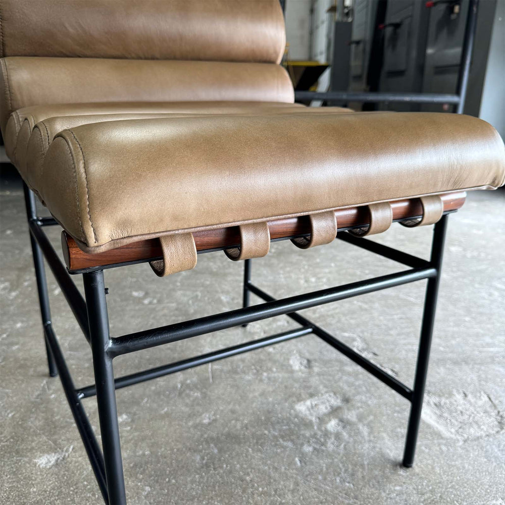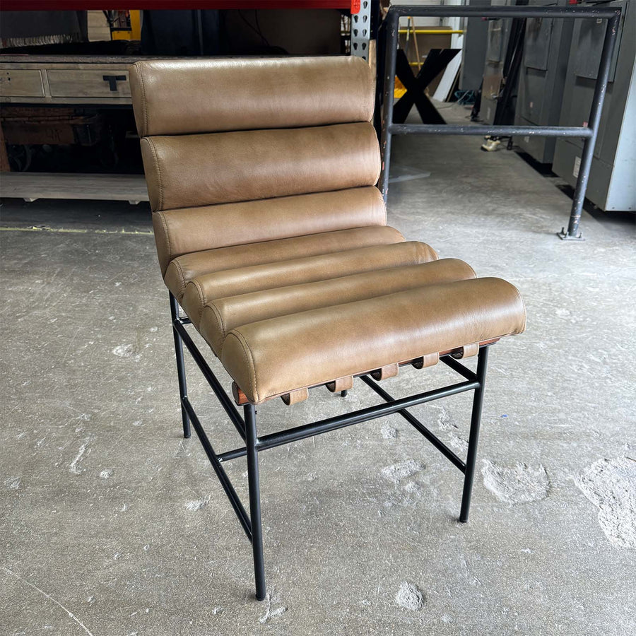 Beautiful leather channeling, the Vail dining chairs have gorgeous wood detailing and are supported in a slim iron frame.